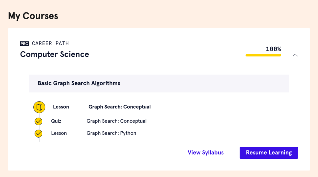 - Lessons (conceptual and practical): every course usually has between 4-8 lessons that build on from the ones previous. These lessons take you through either larger conceptual ideas (e.g. Asymptotic Notation) or practical code application. You must complete each step to move onto the next, but if you get stuck at any point you can review the course “Cheat Sheet” or even “Show Solution” should you need. As there are often multiple ways to code something, and we all start courses at different levels, you may already know how to complete the next step (e.g. when defining a class the first step often says to input “pass” or doesn’t define all parameters you’ll need). However, I would recommend taking it slow. Even on “easier” lessons I still learned ways to code more efficiently and revised my understanding of why we do certain steps in programming.
