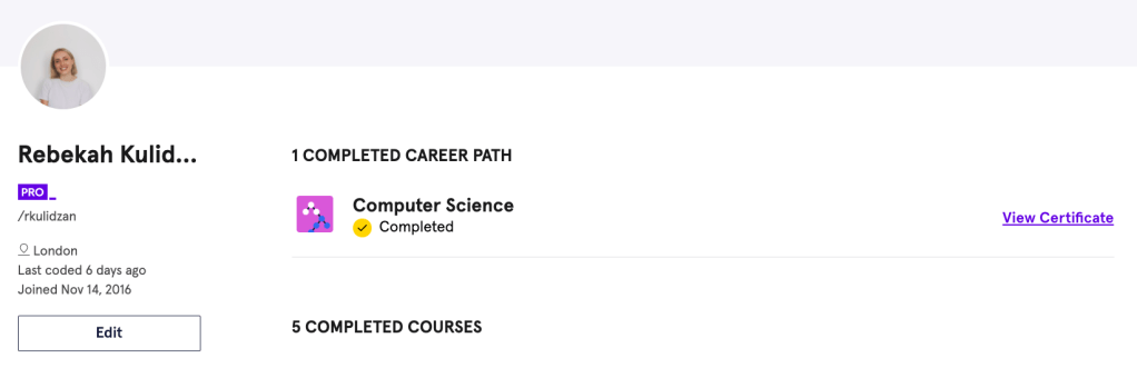 I started this course with Python knowledge. I’ve been working as a data engineer for about four months and code in Python/pandas everyday and I’ve completed courses in web development and other projects in various languages – so many of the introductory concepts were “easy” for me. However, the pathway structure takes multiple courses and concepts to build a portfolio of understanding in one area e.g. Computer Science. And I found it useful on one day to go back to an initial lesson on Python functions to make sure I understood them as intended for this course.